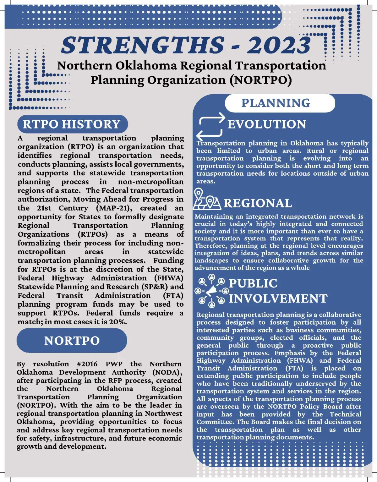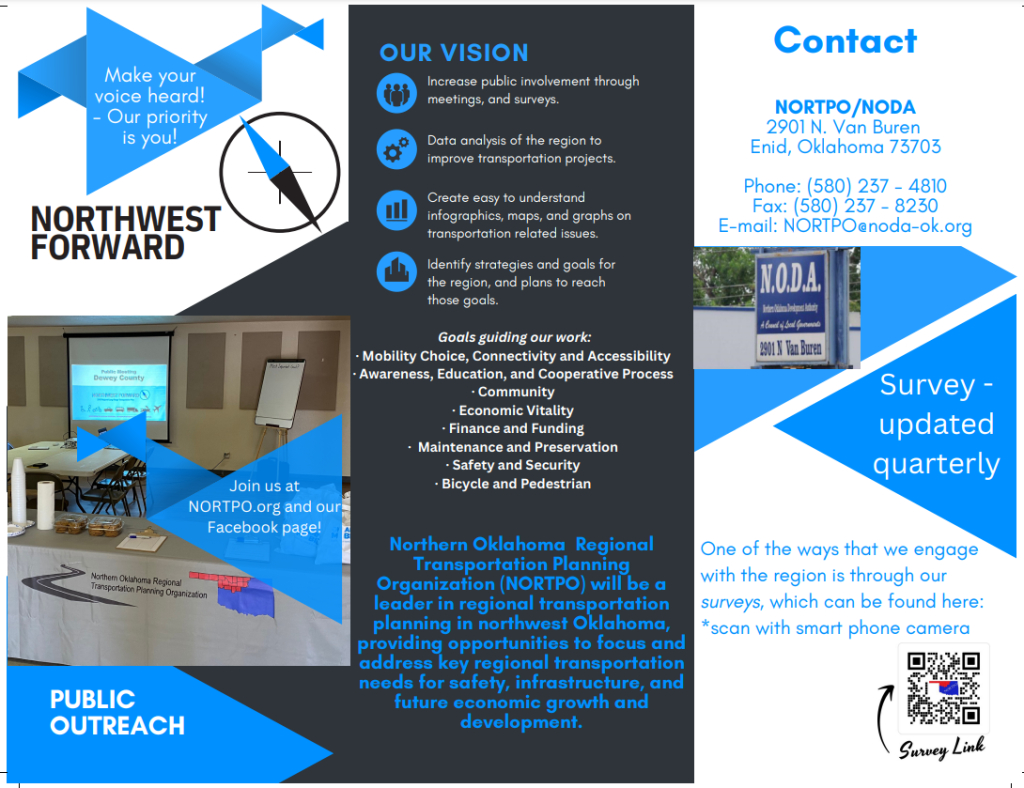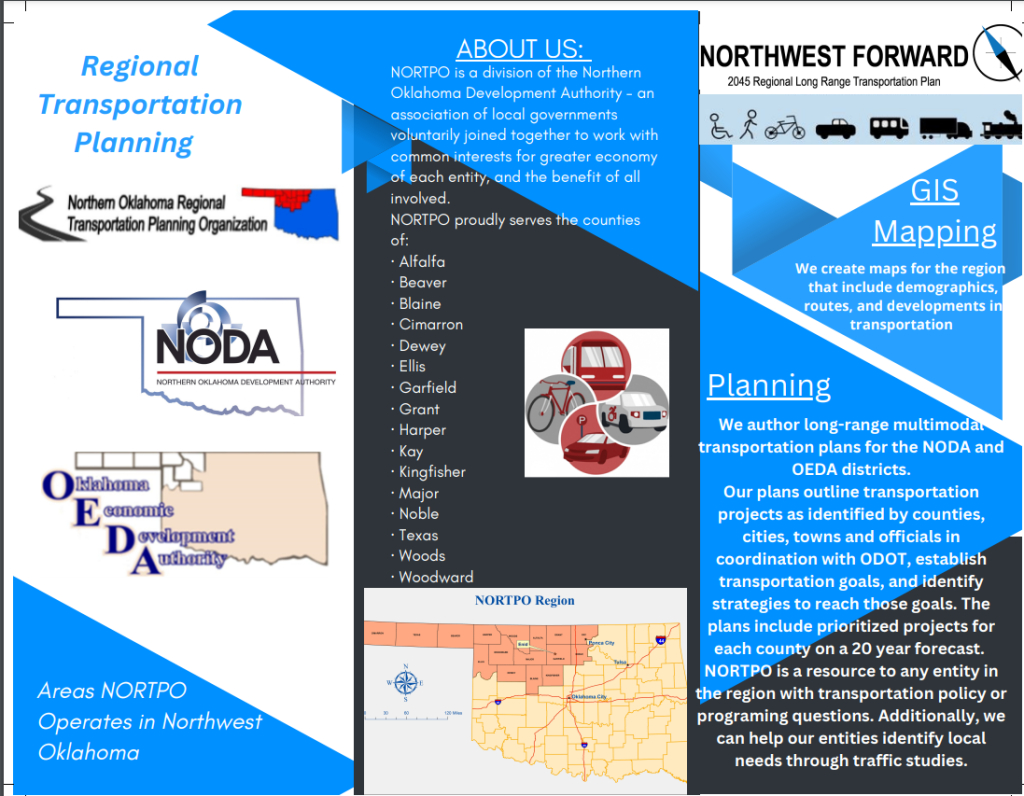 Northern Oklahoma Regional Transportation Planning Organization (NORTPO) is a Regional Transportation Planning Organization (RTPO), as designated by the Oklahoma Department of Transportation (ODOT). Our region consists of 16 counties in north central and northwest Oklahoma.