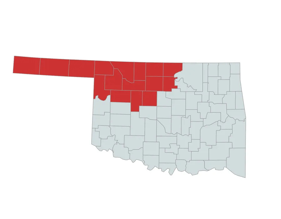 Alfalfa, Beaver, Blaine, Cimarron, Dewey, Ellis, Garfield, Grant, Harper, Kay, Kingfisher, Major, Noble, Texas, Woods and Woodward counties.