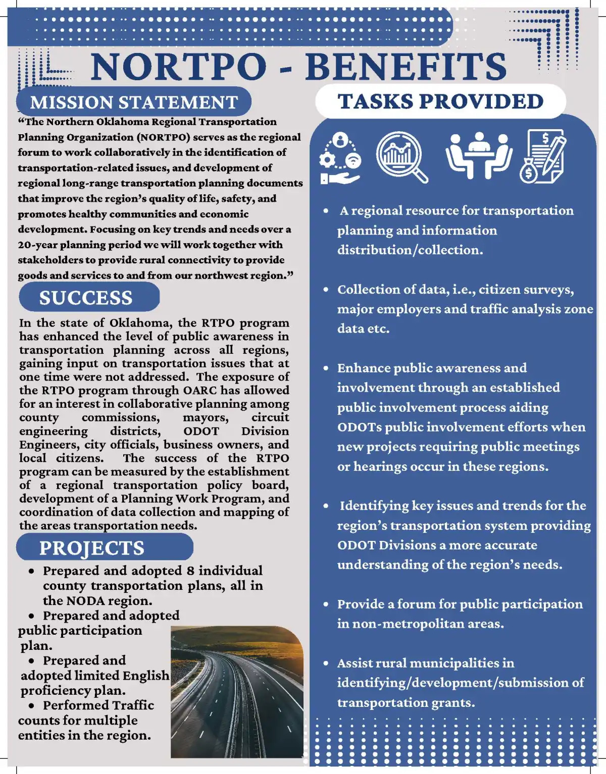 Northern Oklahoma Regional Transportation Planning Organization (NORTPO) is a Regional Transportation Planning Organization (RTPO), as designated by the Oklahoma Department of Transportation (ODOT). Our region consists of 16 counties in north central and northwest Oklahoma.